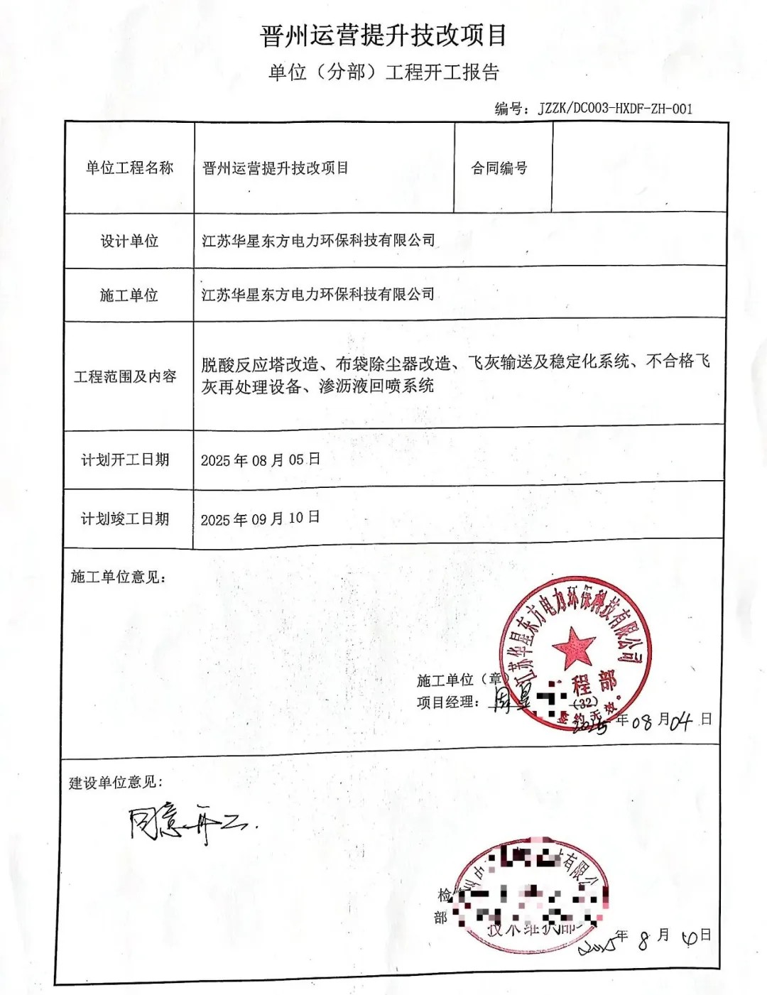 華星東方承建的河北省石家莊市晉州市生活垃圾焚燒發(fā)電提升技改項目煙氣凈化工程于2025年08月05號開工建設(shè),于08月27號已安裝完成通過初步驗收。