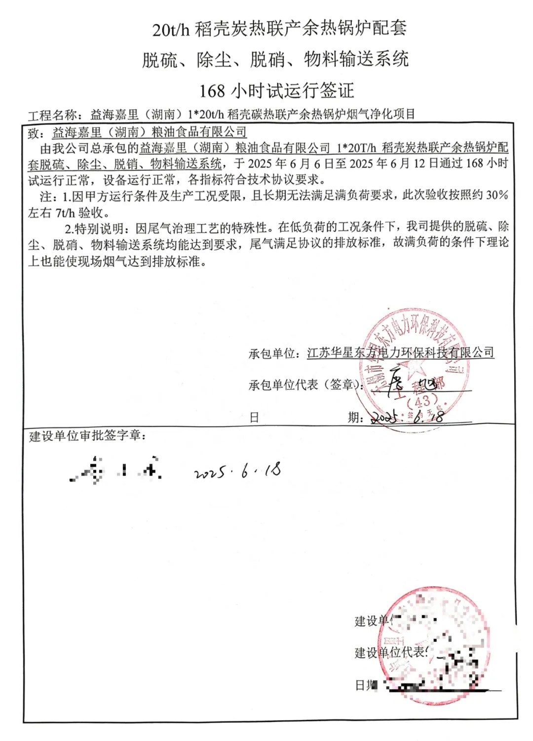 我公司承建的湖南省長沙市益海嘉里稻殼碳熱聯(lián)產(chǎn)余熱鍋爐煙氣凈化項目于2025年06月12日通過168小時試運行。